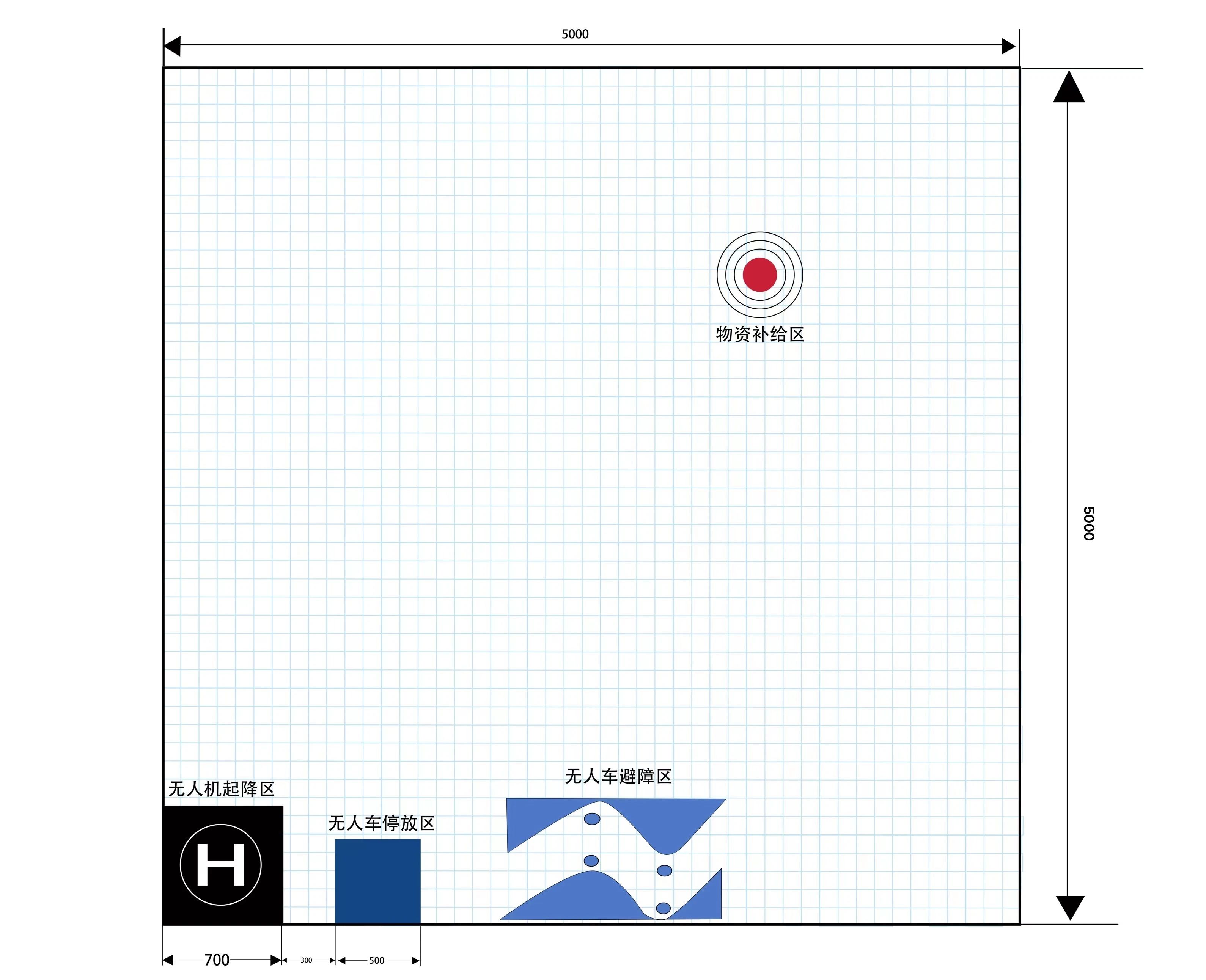 此任務(wù)為設(shè)計(jì)一個(gè)由四旋翼無(wú)人機(jī)及無(wú)人車構(gòu)成的空地協(xié)同物資投放系統(tǒng)。無(wú)人機(jī)上安裝垂直向下的激光筆,用于指示巡邏航跡。巡防區(qū)域?yàn)?5m× 5m。無(wú)人機(jī)巡邏時(shí)可覆蓋地面 0.8m 寬度區(qū)域。以縮短完成全覆蓋巡邏時(shí)間為原則,在巡防區(qū)域內(nèi),無(wú)人機(jī)按照規(guī)劃航線巡邏發(fā)現(xiàn)圓形物資補(bǔ)給區(qū)(每支參賽隊(duì)比賽時(shí)物資補(bǔ)給區(qū)位置隨機(jī)擺放,原則上區(qū)域的隨機(jī)生成不會(huì)破壞比賽公平性)后立即采取初步措施,并將物資補(bǔ)給區(qū)的位置坐標(biāo)發(fā)給無(wú)人車,無(wú)人車抓取物資后前往目標(biāo)點(diǎn)進(jìn)行投放,返回到原點(diǎn),任務(wù)完成。無(wú)人機(jī)和無(wú)人車全程自主控制。