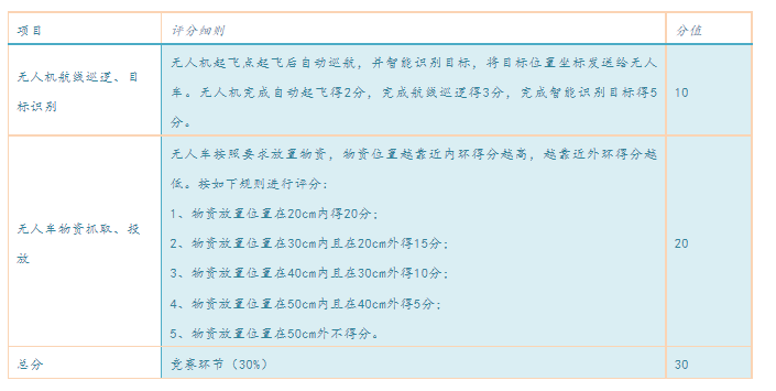 4、無(wú)人機(jī)發(fā)現(xiàn)物資供給區(qū)后,將位置數(shù)據(jù)通過(guò)無(wú)線通信方式發(fā)送給無(wú)人車,使其前往供給區(qū)抓取物資,并將物資放至指定位置,投放物資時(shí),越接近圓盤中心處分?jǐn)?shù)越高。投放完畢后,隨即返回原位置,任務(wù)完成;
