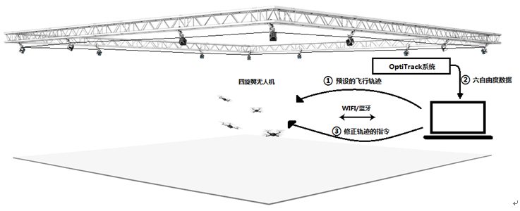 整個(gè)過程可簡(jiǎn)化為:計(jì)算機(jī)通過WIFI、藍(lán)牙或無線數(shù)傳等數(shù)據(jù)傳輸模塊輸出飛行控制指令給無人機(jī),無人機(jī)接收到飛行指令后自主飛行。運(yùn)動(dòng)捕捉系統(tǒng)實(shí)時(shí)捕捉到無人機(jī)的六自由度信息,并傳回控制計(jì)算機(jī)??刂朴?jì)算機(jī)根據(jù)預(yù)設(shè)的飛行軌跡和實(shí)際的飛行軌跡的差別,修正飛行參數(shù),并重新發(fā)送飛行控制指令給無人機(jī),從而控制無人機(jī)高精度的、平穩(wěn)的、無偏差的飛行。