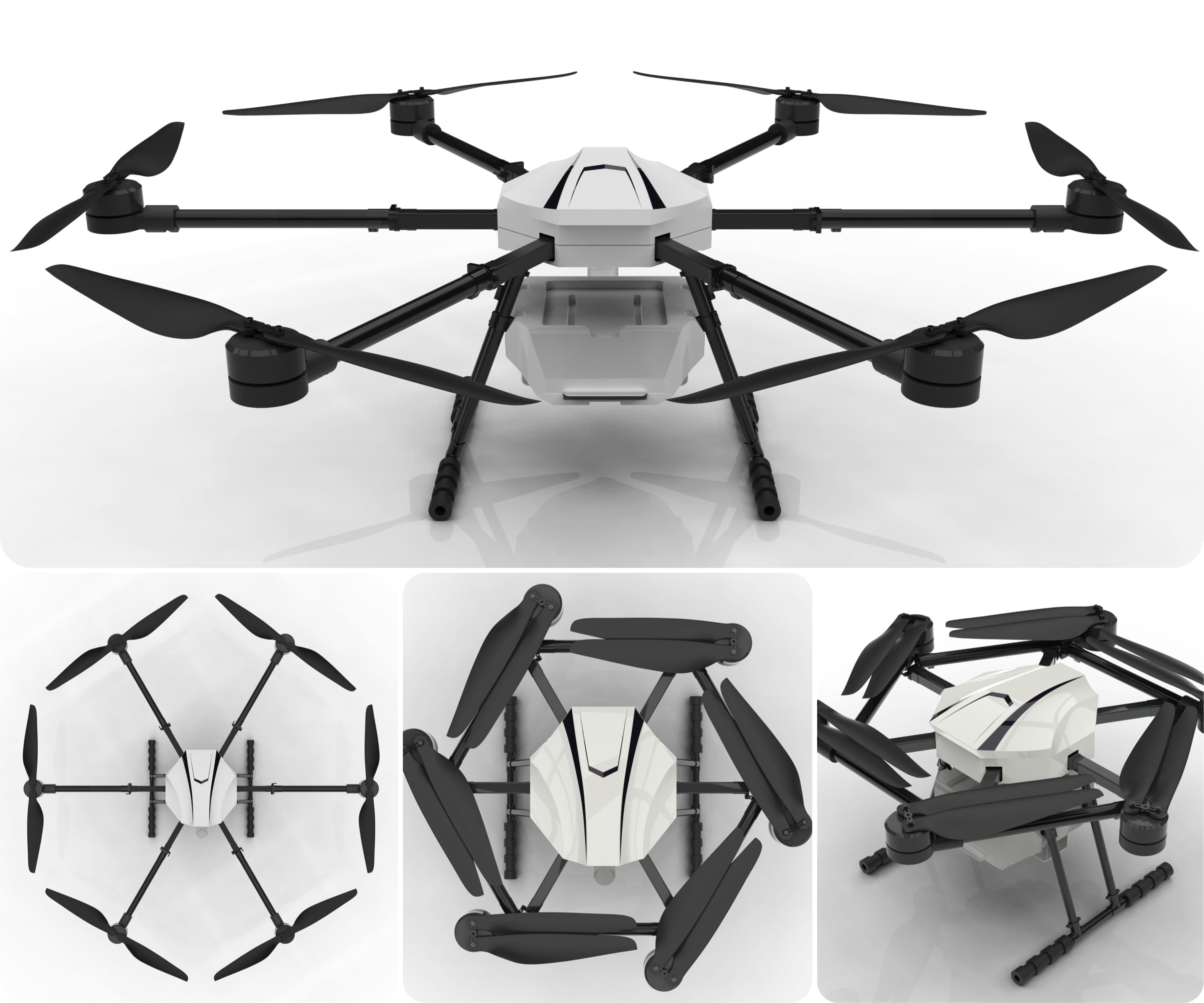1、外形尺寸直徑1.3m,機臂可折疊結構設計,六旋翼結構;