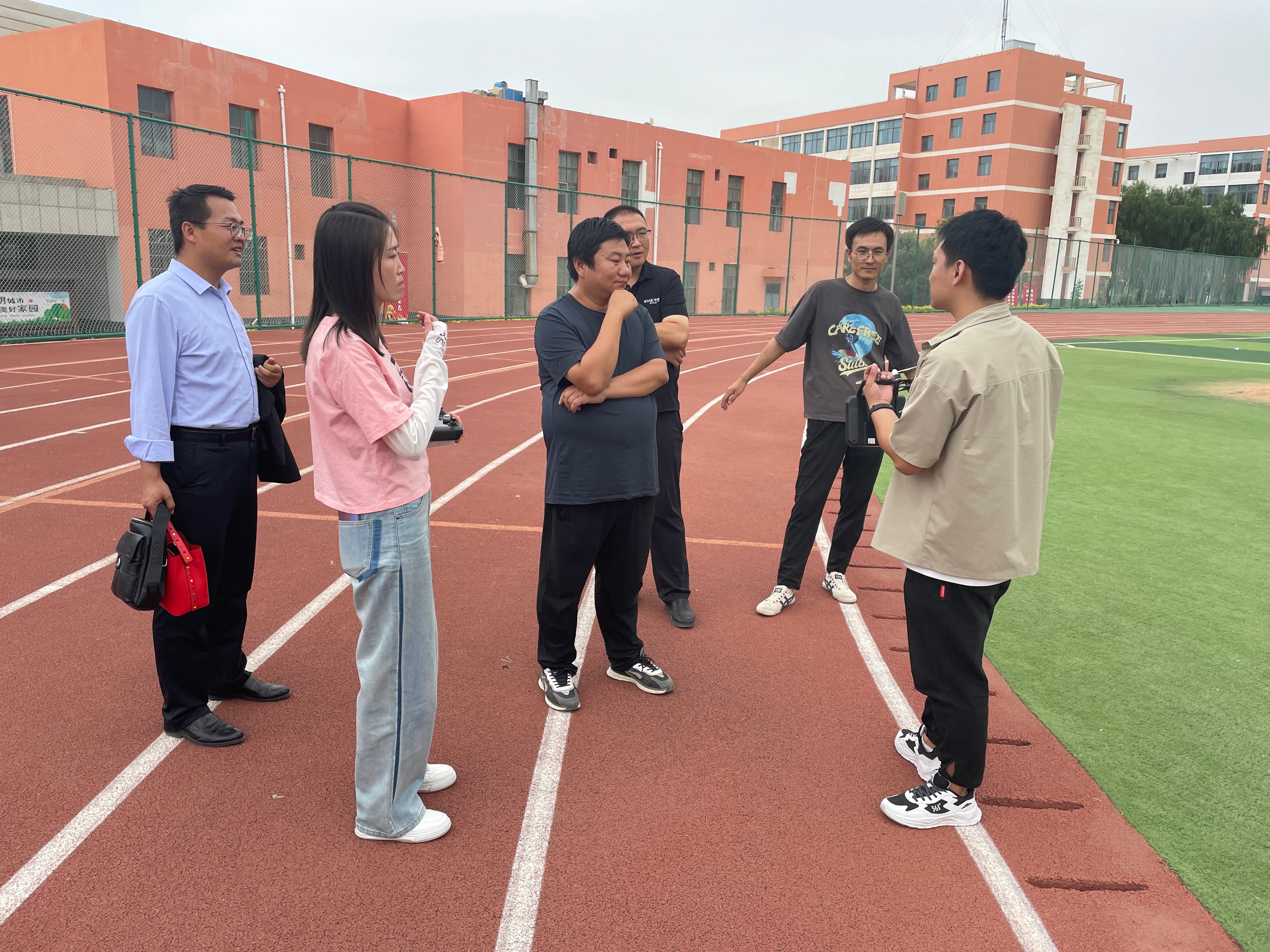 工程師在室外操場講解無人機(jī)的飛行原理及遙控器的使用方法