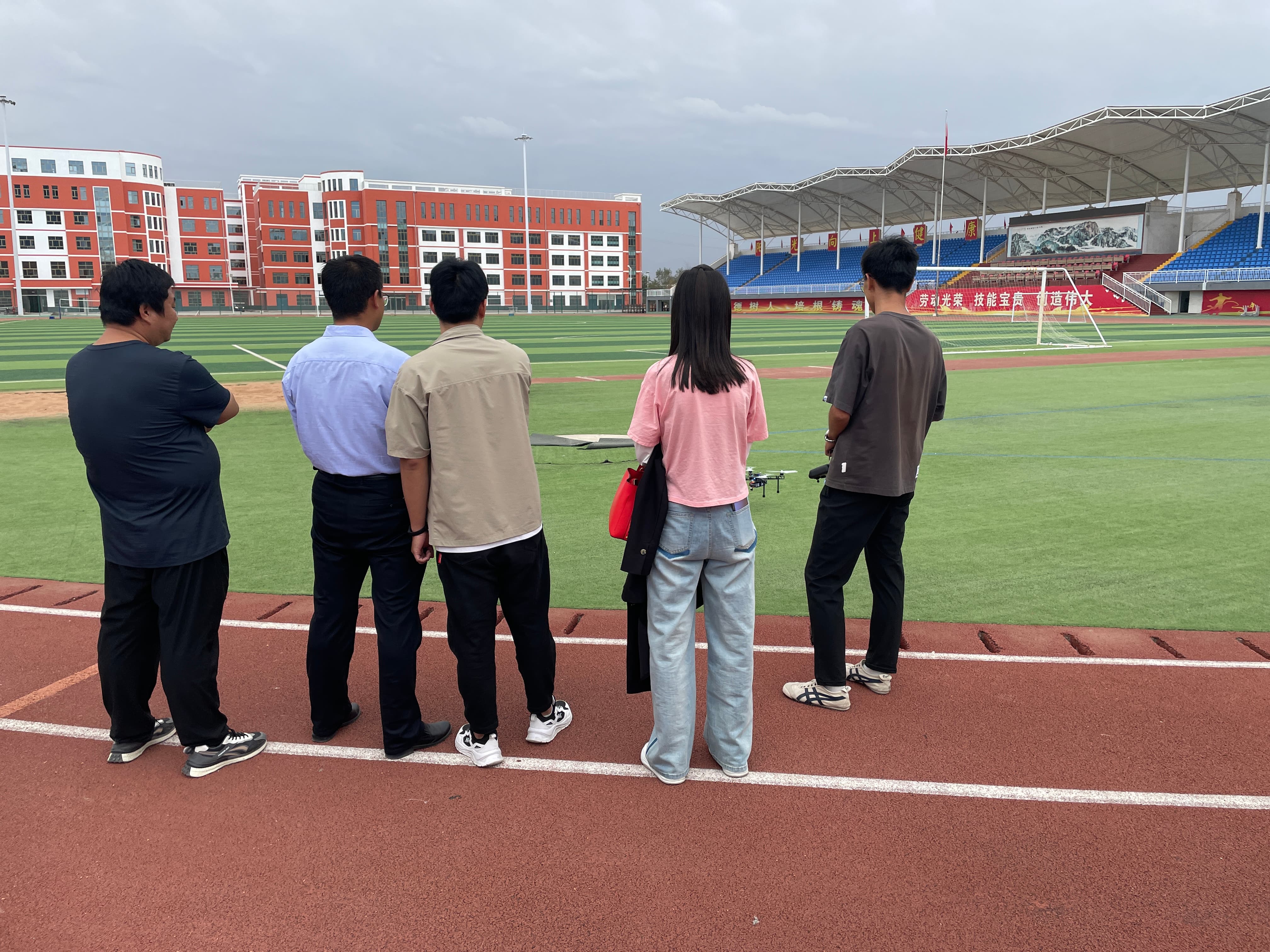 工程師在室外操場演示無人機(jī)飛行操作步驟