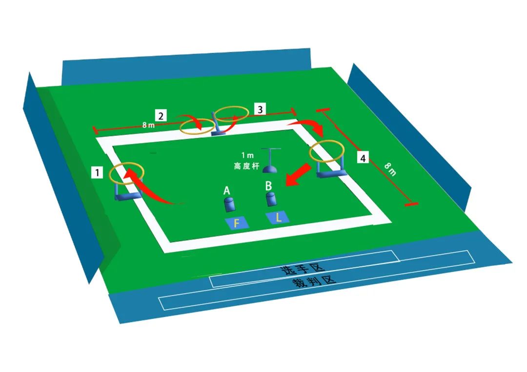 競速飛行環(huán)節(jié)由每個(gè)參賽隊(duì)伍派出2名選手,完成競速飛行任務(wù)。裁判對(duì)垂直起飛高度偏移、垂直起飛兩側(cè)偏移、四面懸停高度偏移、四面懸停兩側(cè)偏移、障礙穿越、是否出賽道等指標(biāo)進(jìn)行評(píng)判打分。
