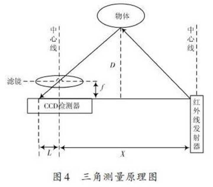 紅外線的應用我們并不陌生:從電視、空調的遙控器,到酒店的自動門,都是利用的紅外線的感應原理。而具體到無人機避障上的應用,紅外線避障的常見實現(xiàn)方式就是「三角測量原理」。紅外感應器包含紅外發(fā)射器與CCD檢測器,紅外線發(fā)射器會發(fā)射紅外線,紅外線在物體上會發(fā)生反射,反射的光線被CCD檢測器接收之后,由于物體的距離D不同,反射角度也會不同,不同的反射角度會產(chǎn)生不同的偏移值L,知道了這些數(shù)據(jù)再經(jīng)過計算,就能得出物體的距離了,如下圖所示。