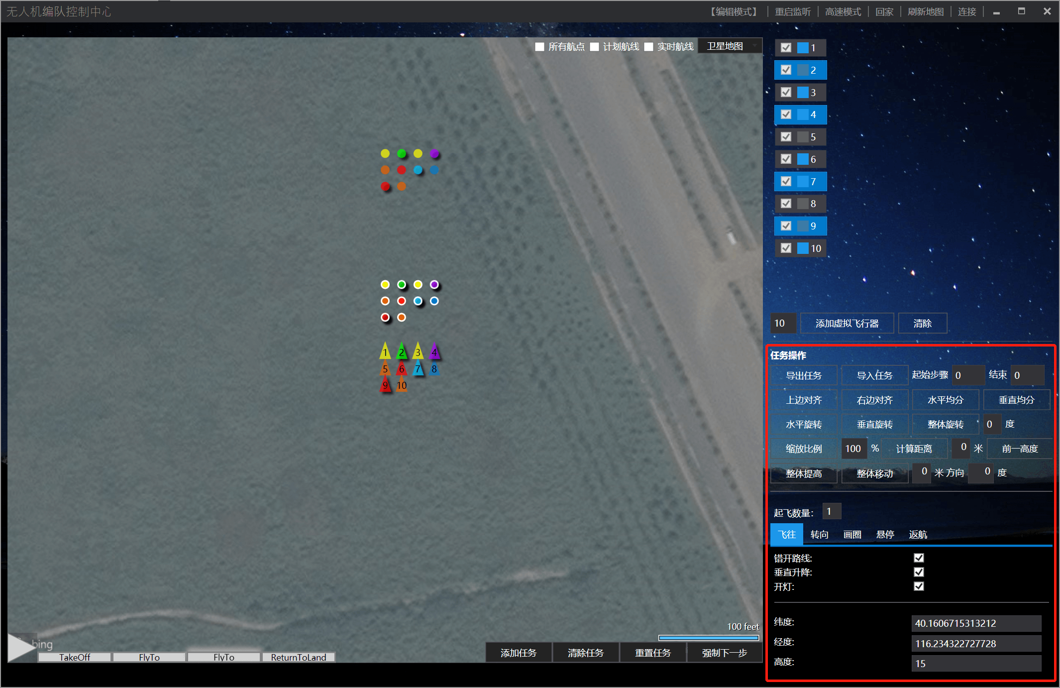 編隊地面站系統(tǒng)實時接收并顯示每架飛機(jī)位置,并根據(jù)預(yù)先編好的隊形實時控制飛機(jī)飛行,飛行過程中根據(jù)飛行線路自動計算并避免可能的碰撞,控制系統(tǒng)對起飛和降落做了專門優(yōu)化,使大規(guī)模編隊對起降場地要求最小化。